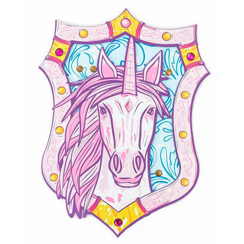 En rigtig prinsesse behøver ingen prins til at redde sig - og med dette smukke skjold fra Great Pretenders kan hun let forsvare sig imod både drager og onde riddere. Skjoldet er lavet i tykt og robust EVA skum og er udsmykket med flotte farver og et våbenskjold med billede af enhjørning. Nederst på skjoldet sidder en fin funklende ædelsten. Perfekt skjold til rolleleg og udklædning, hvor der skal kæmpes store kampe. Skjoldet er fra canadiske Great Pretenders, der har specialiseret sig i at lave flotte kostumer og tilbehør til børn. Produkterne designes med vægt på kreativitet, fantasi og god kvalitet. Udklædning er en vigtig del i barnets udvikling, hvor det stimulerer identiteten og lærer barnet om sociale spilleregler. Materiale: EVA skum i flere lag Fra 3 år Se alle varer fra Great Pretenders