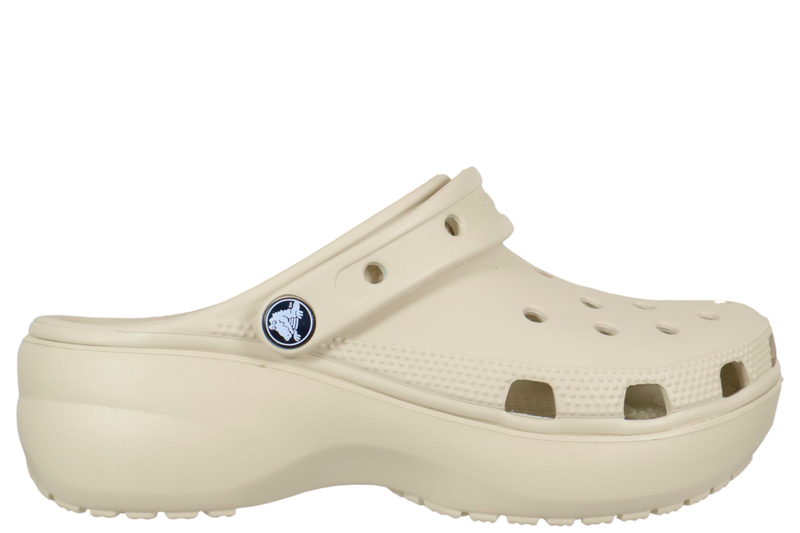 CROCS CLASSIC PLATFORM CLOG W. Beige farvet clogs i gummi fra Crocs med plateau. De er super lette og luftige med huller over forfoden. Remmen kan bruges både over vristen og omkring hælen. Skoen er antibakterielle. De er super nemme at komme i og skønne at bruge. Tåler vand. .. Læs mere på https://www.juul-sko.dk/damesko/traesko/crocs-16059-str37-38.htm