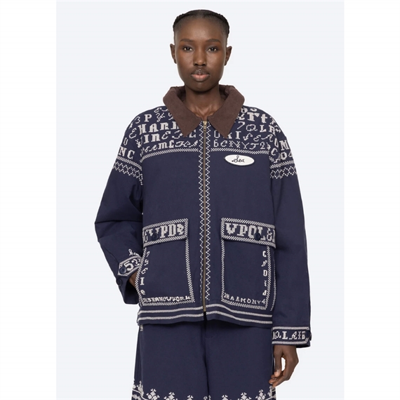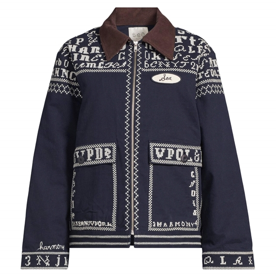 Denne skønne jakke fra Sea New York kombinerer funktionalitet med et smukt broderet design. Jakken er udført i en dyb navyblå farve med kontrastfulde, vævede mønstre og dekorative tekstdetaljer, som giver et kunstnerisk og moderne udtryk.