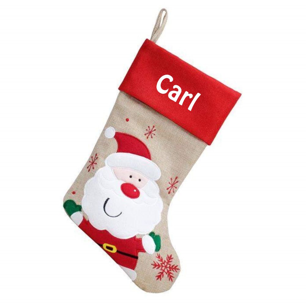 Julesok med julemand Julesokken er syet i groft stof og foret med rødt foer Julesokken måler: (alle mål er ca. ) Åbning: 20 cm Højde: 40 cm Bredde: 25 cm Diagonal: 46 cm Materiale: 100% polyester Ved køb af navn kan du vælge mellem flere trådfarver og skrifttyper. Den valgte skrifttype ser du ved at du taster navnet ind i tekstfeltet og herefter vælger skrifttype, navnet vil da ændre udseende alt efter hvilken skrifttype du vælger.