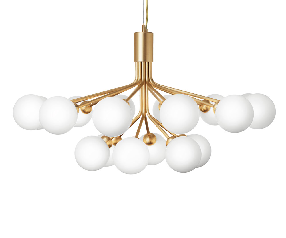 Design:Sofie ReferBeskrivelse:Med inspiration fra blomster har Sofie Refer designet den nye lysekronekollektion, Apiales. Apiales 18 består af atten mundblæste glaskupler og fås i gylden Brushed Brass Finish eller fløjsblød Satin Black. Fra en specialproduceret kappe folder de elegante rør sig ud som blomsterstilke og fuldendes af de mundblæste glas, hvorfra lyset spredes med ynde og sanselighed. Apiales 18, passer med sin diameter på 90 cm. som centrepiece i foyeren, den store stue eller ved det store spisebord.Materiale: Mundblæst glas Overfladebehandlet metal - Mærker > Nuura - Nuura