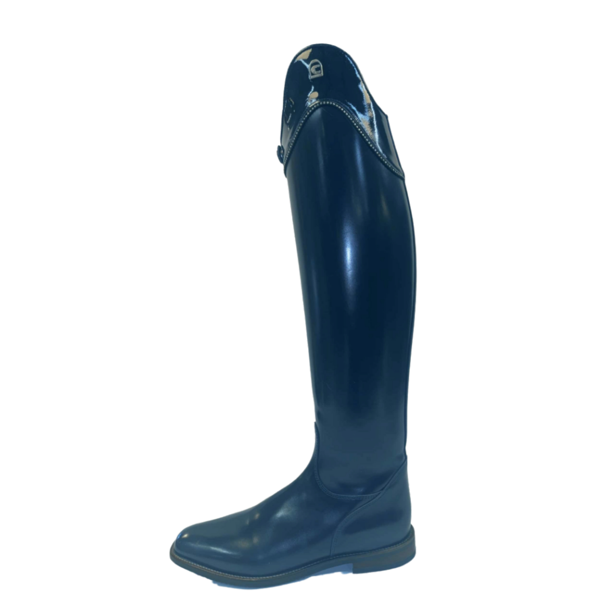 Cavallo Insignis Slim Lux Blå med Lak top med kant af skinnende crystaller. Meget elegant dressurstøvle med ekstra høj bue. Modellen er med slank ankel og indvendig lynlås helt til foden. Hård yderside og mellem hård inderside med grip læder som giver en utrolig god støtte Farve Blå med Lak top med kant af skinnende crystalle og brun sål. Sko str 5 Vide 35cm højde 48cm På lager, klar til afsendelse. Demo støvle fra butikken. Enkelte små crystaler mangler