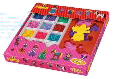 6000 Hama midi perler, 5 forskellige stiftplader, designark, strygepapir og instruktionsark.