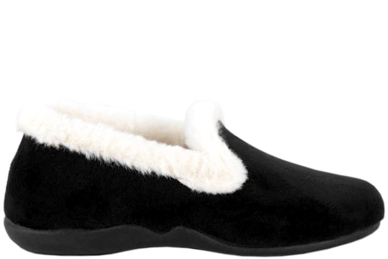 LBDK. Sort hjemmesko til damer i sort plys med hvid kant i plys. Den er med lukket hælkappe, men den er nem lige at stikke foden i. Slidsålen er en sort gummisål, så de tåler man lige smutter ud i dem. Dejlig hjemmesko fra LBDK til damer. .. Læs mere på https://www.juul-sko.dk/damesko/dame-hjemmesko/lbdk-10582-str37.htm