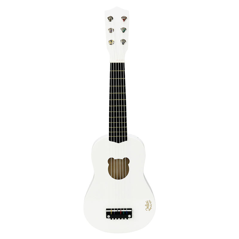 Flot hvid legetøjsguitar fra Vilac med 6 strenge fremstillet i lakeret egetræsfiner. En rigtig fin guitar til alle børn, der elsker musik, og som udfordrer både finmotorik og koordinationsevne. Sammen med guitaren følger et plekter samt ekstra strenge. Materiale: egetræ Måler 52 x 18 x 6 cm. Fra 3 år NB: Spænd guitarstrengene ved at skrue på grebene. Stram evt. grebene med en lille stjerneskruetrækker, hvis de løsnes, og strengen ikke kan spændes. Se alle varer fra Vilac