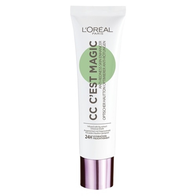 CC står för "Color Corrector". L'Oréal CC Cream C'Est Magic Anti Redness är en lätt kräm som jämnar ut hudtonen. Den innehåller färgkorrigerande pigment som ger ditt ansikte en fräsch glöd och jämn hudton. Den skapar ett fint, jämnt utseende genom att göra porer, små rynkor och färgskillnader i huden mindre synliga.