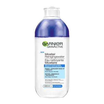 BeskrivningGarnier Micellar Cleansing Water - rengöringsvatten för normal och känslig hud. Detta rengöringsvatten passar dig med normal och känslig hy som vill ha en effektiv, snabb och lättanvänd produkt som rengör huden och tar bort makeup på en gång. När micellärvattnet appliceras på en bomullstuss som älskar vatten, är det den yttre delen av micellen som fäster på bomullstuss som en magnet. Detta gör att smuts enkelt kan torkas bort. Användningen av Micellar Water är ett enkelt och naturligt sätt att ta bort makeup enkelt och snabbt, samtidigt som det är skonsamt mot huden och ögonfransarna.Innehåll400 mlOm GarnierGarniers grundades i Frankrike 1904, när Alfred Amour Garnier utvecklade de första växttonerna för hår, som snart blev en hit hos kunderna. 1960 utvecklades den första Garnier-hårfärgningen för hemmabruk. Andra produkter som omedelbart har blivit populära är bland annat Garniers Miscellar Water och Garnier Pure Active cleansing gel Garnier utvecklar effektiva kropps- och ansiktsvårdsprodukter inspirerade av naturen, i en prisklass där alla kan delta. Garnier har alltid speglat kundens behov i sina produkter. Garniers finns idag i mer än 120 länder runt om i världen.Aktiva ingredienserMiceller är osynliga, koncentrerade molekyler som älskar både vatten (hydrofil) och olja (oleofil). Det betyder att de kan ta bort smuts som är både vatten- och fettlöslig, eftersom molekylerna naturligt attraheras av både fett och vattenbaserade ämnen. Miceller omsluter fett- och vaxbaserade smutspartiklar i sitt oleofila centrum, så partiklarna kan enkelt tas bort utan att behöva klumpa ihop sig eller irritera huden.