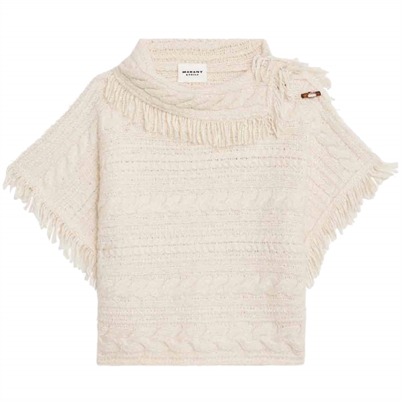Denne elegante poncho i råhvid fra Isabel Marant Etoilé er designet i en blød struktur med korte ærmer, frynsekanter og spændedetaljer på skulderen. Den løse, boxy pasform giver et afslappet, men sofistikeret look, perfekt til lag-på-lag styling i overgangssæsonerne.
