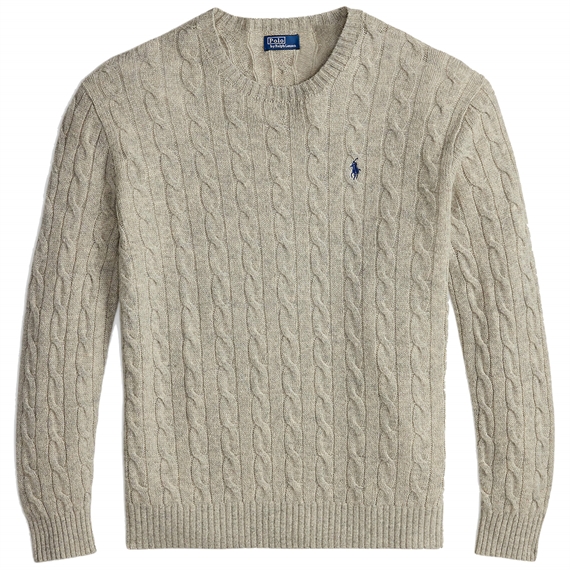 Opgrader din garderobe med denne Polo Ralph Lauren rund-hals strik i Light Vintage Heather. Med en ribstrikket halsudskæring, lange ærmer, blå pony broderi på brystet, ribstrikkede manchetter og bund, samt et kabelstrikket design. Strikken kommer i en lækker blød blandning af uld & cashmere.