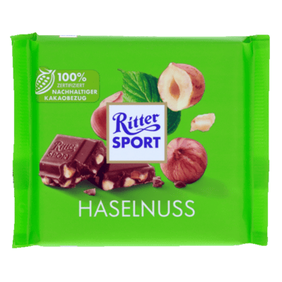 Ritter Sport Mælk med Hasselnød ligner Ritter Sport Mælk med hel nød. Forskellen er, at i denne Ritter Sport-variant er de ristede hasselnødder hakket fint, inden de bliver blandet i mælkechokoladen. Passer lige i baglommen. Indeholder 100 g.