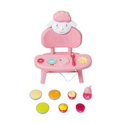 Produktbeskrivning Baby Annabell already eats purée. But we haven’t yet figured out which kind she really likes. The pink chair with its lamb backrest and table can help with that. Time for the main course. Carrot or pea purée or rice porridge? When the bowl is placed on the relevant sheep, light and sound indicate whether or not Baby Annabell likes her lunch. If the field lights up green, the little doll murmurs happily and eagerly waits for the next spoonful. If it lights up red, try giving her another dish, otherwise Baby Annabell will propluus.se with a loud "Yuck!". For dessert there’s pudding, fruit compote and pear purée, with a bottle of milk, apple juice or water. What will her favourite menu look like today? • Original clothing/accessories for the Baby Annabell branded doll • The premium quality accessories boost the imagination and offer new possibilities and stimuli for play • Batteries required Baby Annabell Lunch Time Table with light and sound effects. Includes 3 main meals, 3 desserts, bottle and spoon.