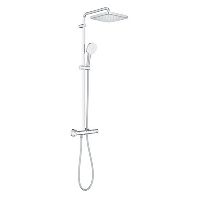 Et Grohe vægmonteret komplet brusesystem består af et moderne termostatblandingsbatteri som kontrollere vandet og flowet, herpå er der monteret et brusestangssæt med en håndbruser og et firkantet bruserhoved på 250 x 250 mm.