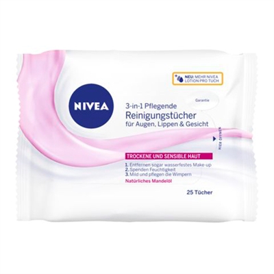 Nivea Visage Facial Cleansing Wipes 25Pcs Caring tar effektiv bort både smuts och smink i ansiktet och runt ögonen utan att störa hudens naturliga balans. Resultat: En hud som känns ren, mjuk och bekväm. En lysande hy. Nivea Visage Facial Cleansing Wipes 25Pcs Caring stärker hudens elasticitet på djupet, vilket gör att produktionen av kollagen och elastin ökar .