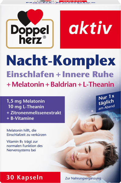Tilstrækkelig og god søvn er vigtig for velvære og en forudsætning for en god dag. Her spiller både omgivelserne og roen, samt afslapningen af musklerne, en vigtig rolle. Søvnen består af flere cyklusser, hvor vigtige processer finder sted i kroppen. Ro- og afslapningsfaser veksler med dyb søvn, oplevelser bearbejdes, og det lærte lagres. Doppelherz Nacht-Komplex Einschlafen + Innere Ruhe Kapsler er beregnet til indtagelse før sengetid. De understøtter næringsforsyningen om natten med melatonin, baldrian og L-theanin. Derudover indeholder de citronmelisseekstrakt og B-vitaminer. Den anbefalede daglige dosis bør ikke overskrides.