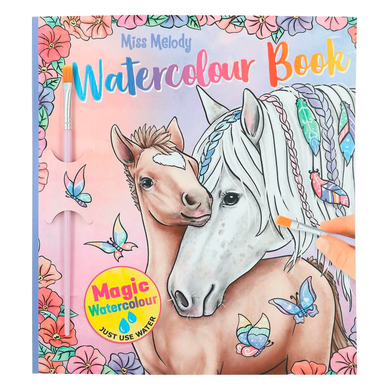 -magisk akvarelbog med Miss Melody heste -brug den medfølgende pensel og lidt vand til at stryge over bogens motiver -når vandet rammer papiret, vil farven på magisk vis dukke frem (forsvinder ikke igen) -måler 22 x 20 cm -fra 3 år Se alle varer til rejsen