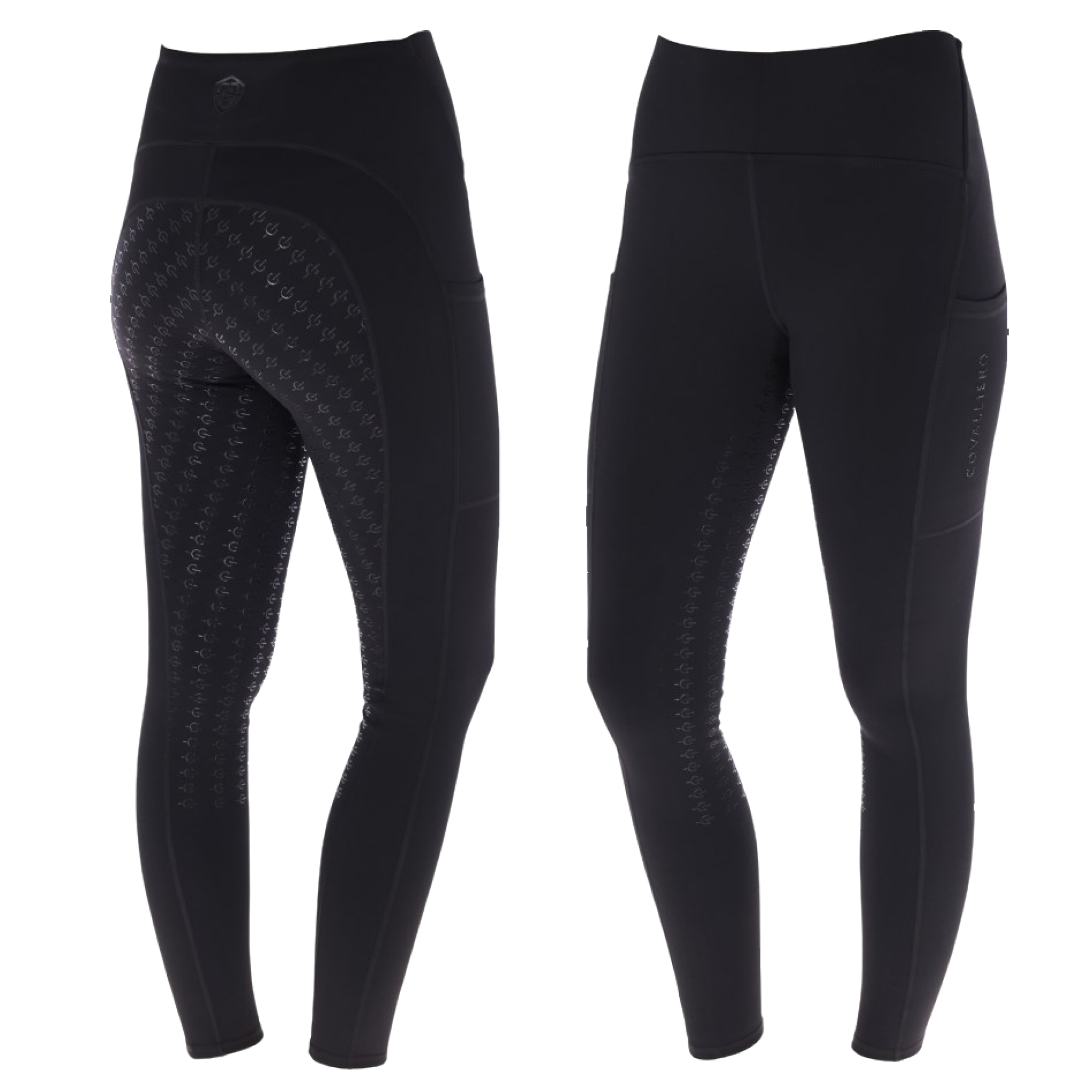 Covalliero vinter Tights med grip – Komfort og fleksibilitet til kølige dage Disse ridetights kombinerer høj elasticitet med et blødt og varmende inder side, hvilket gør dem ideelle til de koldere måneder. Den komfortable linning giver en behagelig pasform, mens det moderne design med glitterdetaljer tilfører et elegant touch. Detaljer: Ekstremt elastiske med 4-vejs stretch Softshell-lignende kvalitet med varm inderside Varme- og fugtregulerende samt åndbare Formstabile, bløde og lette To sidelommer med glitterapplikation Fuldskindsgrip med Covalliero-design Maskinvask ved 30 °C Et par funktionelle og stilfulde ridetights, der sikrer både komfort og bevægelsesfrihed i sadlen.