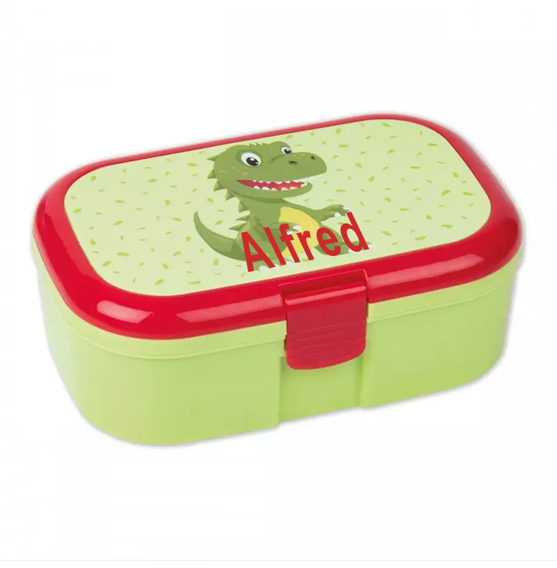 Sjov og smart madkasse med sød lille dino. Madkassen kan inddeles i rum med en separat beholder, så maden ikke blandes sammen. Stabil madkasse med børnevenlig lukning. Madkassen tåler opvaskemaskine OBS. Ønsker du navn på kan madkassen anbefaler vi at madkassen vaskes i hånden, da navnet ellers kan løsne sig. Godkendt til fødevarer. LFGB-konform Materiale: Polypropylen 100% fri for Phatalater, BPA, Bisphenol A Måler ca.: 16,5 x 10,5 x 6,5 cm OBS. Da vi sætter navn gratis på er der ingen garanti på holdbarheden.