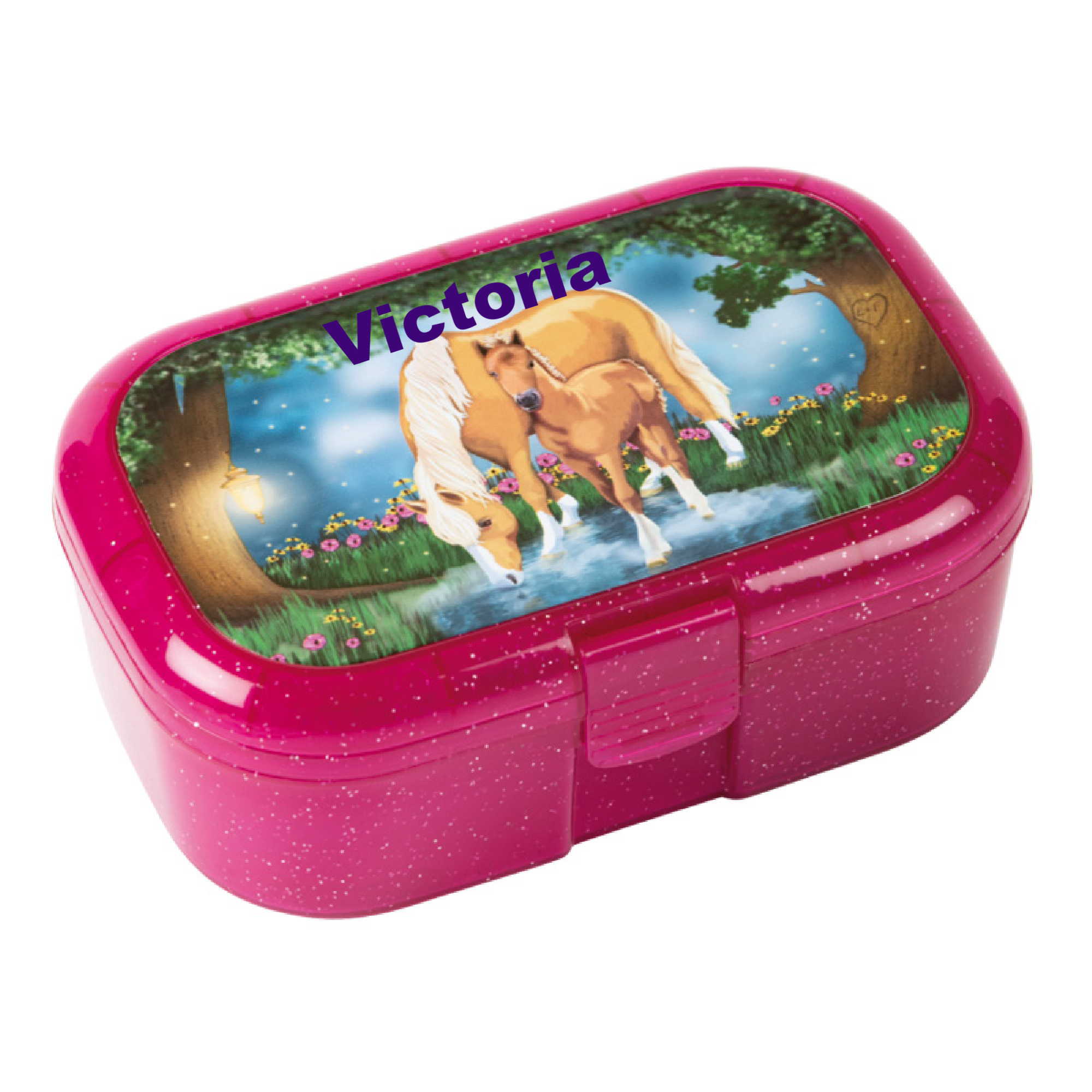 Madkasser skal da være sjove, smarte og med barnets navn Vi sætter navnet oven på låget hvor vi vurderer det vli stå pænest. Det varierer alt efter hvilket motiv som er på madkassen Sjov og smart madkasse med glimmer og hest m/føl Madkassen kan inddeles i rum med en separat beholder, så maden ikke blandes sammen Madkassen tåler opvaskemaskine OBS. Ønsker du navn på kan madkassen anbefaler vi at maskassen vaskes i hånden, da navnet ellers kan løsne sig. 100% fri for Phatalater 100% fri for BPA Måler ca.: 17 x 11 x 6 cm OBS. Da vi sætter navn gratis på er der ingen garanti på dette