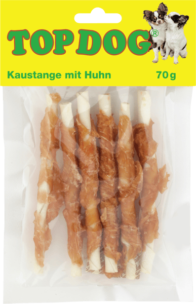 Top Dog Tyggestang giver din hund sundt tandkød og stærke tænder. Tyggelegetøjet til din hund er lavet af rene naturprodukter, herunder kyllingefilet og kvæghud og skåner hundens fordøjelse. En lækker og sund godbid, der også kan bruges som tyggelegetøj. Opbevares tørt og køligt.