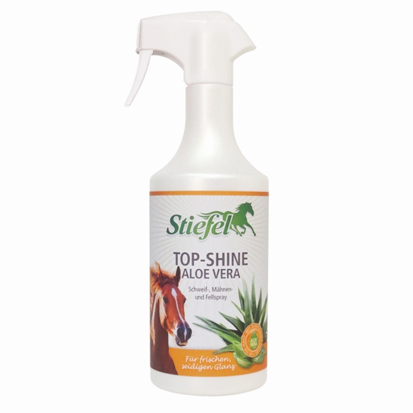 Høj kvalitet pels, man og hale spray med Aloe vera. Top Shine Aloe Vera tilføjer en silkeagtig glans så man, hale og pels bliver nemt at børste. Takket være en usynlig beskyttende film holdes snavs og støv væk så pels, man og hale forbliver silkeblød og skinnende. Indhold.750 ml.