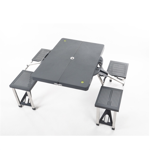 Dette picnicbord folder sammen på midten og har et praktisk bærehåndtag, så du kan transportere det som en kuffert til campingpladsen eller picnicstedet. De fire fast installerede sæder betyder, at du ikke behøver at medbringe separate stole – fold bordet ud, og det er klar til brug. Med en vægt på 6,5 kg kan du nemt bære det fra bilen, mens pakkestørrelsen på 65 x 85 x 11 cm gør det enkelt at opbevare i bagagerummet eller campingvognen.