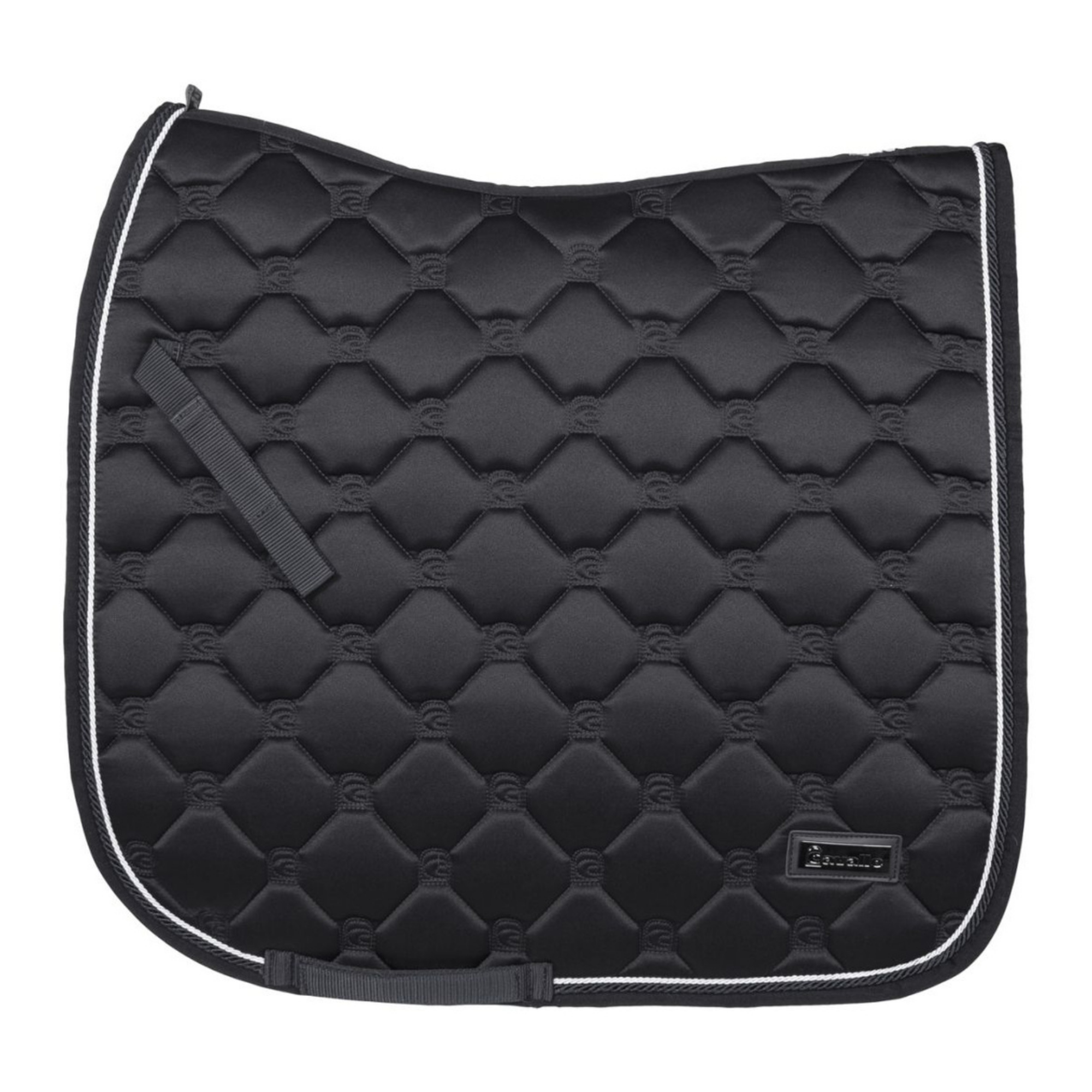 Cavallo Hanaya schabrack Et eksklusivt og stilfuldt dressurunderlag fra Cavallo, designet til rytteren der ønsker både kvalitet og elegance. Underlaget har en skinnende overflade med dobbelt piping langs kanten, som giver et luksuriøst og sofistikeret udtryk. På begge sider prydes underlaget af et Cavallo metalmærke i metallook, der understreger det eksklusive design. Den smukke quiltning med integreret Cavallo-logo kombineres med en blød og fyldig polstring, som giver optimal komfort for hesten. Gjordstropper med velcro sikrer, at underlaget bliver liggende stabilt under ridning, mens den hudvenlige underside med mesh sørger for god åndbarhed og fugttransport. Farve: Sort