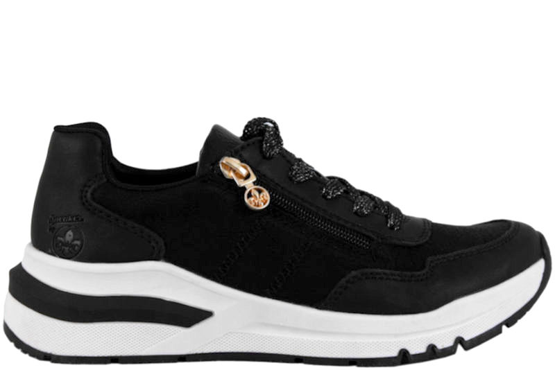 RIEKER. Smart sko fra Rieker til damer. Skoen er lavet i sort PU. Skoen har sorte snørebånd med guldnister samt en guld lynlås med vedhæng på ydersiden, så den er nem at komme i og af. Indvendigt er der en MemoSoft sål, som gør skoen behagelig at have på. Slidsålen er hvid med sorte detaljer, som giver skoen et smart, lidt sporty look. Fin sko til alle anledninger. .. Læs mere på https://www.juul-sko.dk/damesko/damesko-sko/rieker-11815-str39.htm