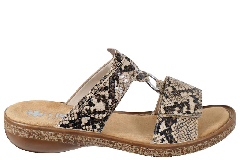 RIEKER. Super fin Rieker slenters til damer. Den er lavet af PU med slange prægning. Henover tærene samt vristen, er der en velcrorem, så den kan tilpasses efter foden. Indvendig er den foret med PU og har en blød og behagelig dæksål. Slidsålen er en brun PU sål. .. Læs mere på https://www.juul-sko.dk/damesko/slippers/rieker-442-1704-str41.htm
