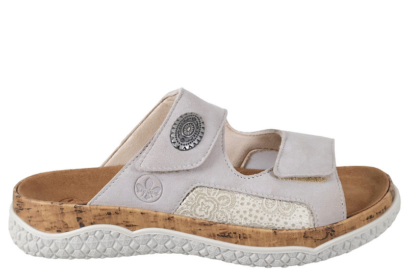 RIEKER SLENTERS. Super fin slenters fra Rieker til dame. Sandalen er lavet af beige skind, med et lille mønster på yder- og indersiden. Sandalen er med to remme der kan justeres med velcro. På den ene rem er der et sølv pynteemblem. Indvendigt er sandalen foret med beige tekstil. Denne model er med ekstra bredde, og med en udtagelig sål. Mellemsålen er med kork-look. Slidsålen er af beige gummi. En super fin slenters til dame. .. Læs mere på https://www.juul-sko.dk/damesko/slippers/rieker-442-1718-str41.htm