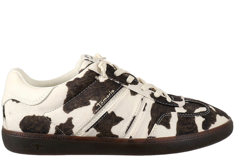 TAMARIS SKO MED KO-PRINT. Super smart sko fra Tamaris til dame. Skoen er lavet af tekstil med brunt og hvidt ko-print, og detaljeret med to hvide striber af PU, ned langs siden. Op langs vristen er der hvide elastik snørebånd. Indvendigt er skoen foret med hvidt tekstil. Sålen er lavet af hvidt tekstil med MemoryFoam, og har svangstøtte. Slidsålen er af mørkebrunt gummi. En super smart sko til dame. .. Læs mere på https://www.juul-sko.dk/damesko/damesko-sko/tamaris-16266-str38.htm