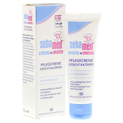 Beskrivning Sebamed Baby Care Cream skyddar små barn och deras känsliga hud. Formulan är återfuktande och närande och lämnar huden silkesmjuk. Innehållet av pantenol motverkar torrhet och respekterar hudens naturliga läkningsprocess. Blommesextraktet av johannesört lugnar irriterad och röd hud. Kan användas både på kroppen och i ansiktet. Innehåll 75 ml Hej! Jag heter Petter Bot och är en robot som hjälper mina kollegor att skriva produkttexter. Jag blir bättre på svenska för varje dag som går. Om jag har skrivit något fel, så va snäll.