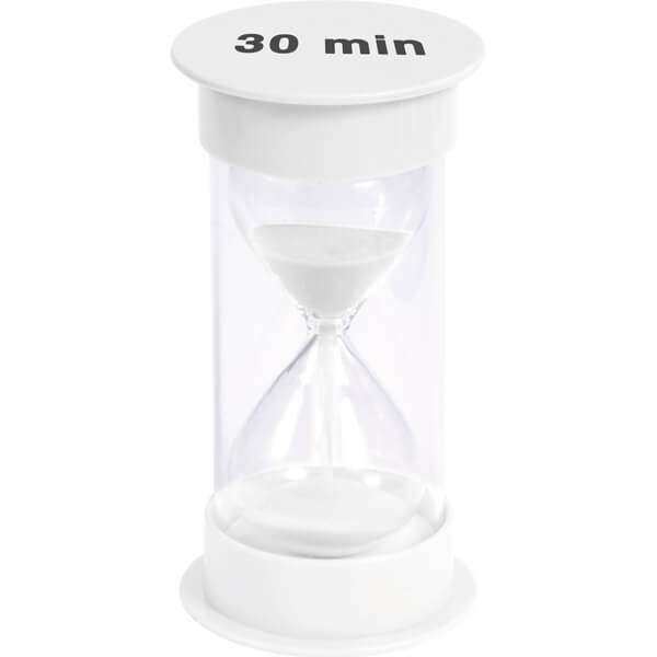Hold styr på tiden med et timeglas eller udfordre hinanden i sjove eksperimenter. Perfekt at bruge ved: Tandbørstning Ud ad døren Sengetid Lektier og andre opgaver Læsning Konkurrence tid Timeglas kan bruges som tidsmåling på mange forskellige måder, det kan være ved fx praktiske ting som ved tandbørstning, læsning mm. Timeglas er også et sjovt redskab at bruge ved leg, eksperimenter og konkurrencer. Dyst i hvem der er hurtigst til at løse en opgave eller et spil. Timeglasset giver også en sansemæssig oplevelse, ved at sidde med den i hånden og se hvordan sandet bevæger sig fra den ene beholder til den anden. Om timeglasset: Varighed 30 minutter (hvid) Materiale: Hårdt plast H: 12 cm D: 6,5 cm Fås i flere tidsintervaller 1 minut 90 sekunder 2 minutter 3 minutter 4 minutter 5 minutter 10 minutter 15 minutter 30 minutter