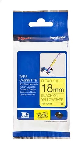 18 mm flexibel tape, svart text på gul botten, laminerad, längd 8 m\n\nTZe-tape är en mer miljöanpassad märktape, den passar de maskiner som använder motsvarande TZ-tape.
