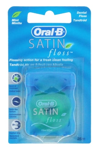 Oral B Satin Floss 25 Metre Mint hjälper till att förhindra tandköttsproblem och karies genom att ta bort plack mellan tänderna.