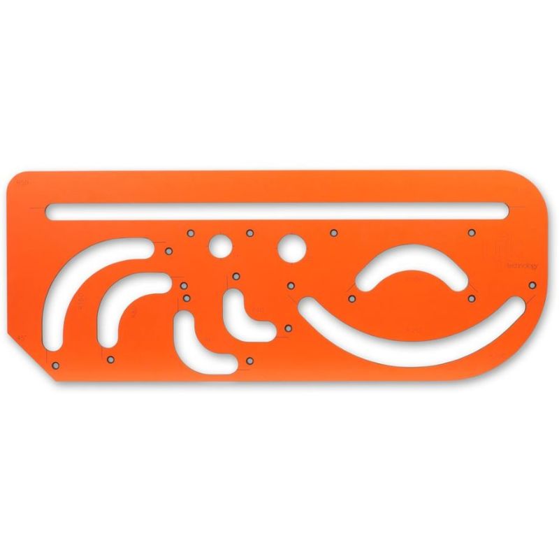 En perfekt partner til din UJK bordpladejig. Skabelonen giver dig mange flere muligheder for at fræse forskellige radiusser både internt og eksternt i bordplader, og er enormt brugbar i et skabs- eller møbelværksted, hvor det ofte er nødvendigt at fræse en bestemt radius. Den er CNC-maskinskåret af 12mm tykt, solidt, kompakt fenolplastic og er derfor enormt præcis, holdbar og stabil. For at sætte den op, skal du sætte lokationspins i de ønskede huller og placere dem i kanten af dit emne. Skabelonen har seks radiusser: 40, 60, 80, 100, 150 og 250mm, både til interne og eksterne snit. Den har et hul til lige fræsninger på op til 820mm, og 26 og 35mm forsænkninger til skabslågehængsler. Hjørnerne af skabelonen kan bruges til 50, 100 og 150mm radiusser, samt en 45mm mulighed. Skabelonen kommer med et fuldt sæt omfattende instruktioner og en pakke med fire sporingspins. Du får brug for et par tvinger for at holde skabelonen fast, samt en 30mm kopiring til din fræser.