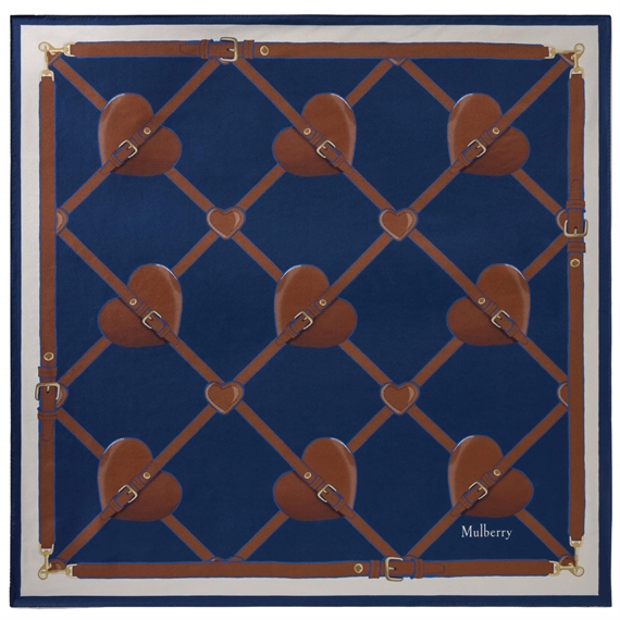 Heart Square Scarf Pigment Blue Silk Twill fra Mulberry er lavet af 100% silketwill og kan bæres enten rundt om halsen eller fastgøres til din yndlings Mulberry taske. Tørklædet måler 67 x 67 cm