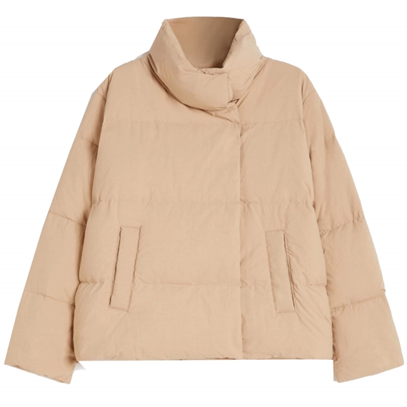 Denne fine dunjakke fra Weekend Max Mara kombinerer funktionalitet med tidløst design. Jakken er fremstillet i et vandafvisende teknisk materiale og har et elegant, lige snit, der gør den perfekt til både hverdagsbrug og mere aktive dage. Det quiltede mønster over hele jakken skaber en let polstret effekt, mens den høje krave med skjult hætte giver ekstra beskyttelse mod vind og vejr. Jakken har lange, isatte ærmer og praktiske paspolerede lommer i siderne. Den lukkes med trykknapper foran for et rent og moderne udtryk.