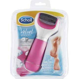 Rosafärgade Velvet Smooth Elektronisk Fotfil från Scholl kombinerar en vackert rosa färg med en extra kraftig rollerhuvud. Refillen är belagd med finmalda diamantkristaller som ger en exklusiv, naturlig peeling. Genom att kristallerna är extra stora går det att ta bort även kraftiga förhårdnader ännu effektivare och skonsammare. Ger påtagligt släta och silkesmjuka fötter.\n\n- Ergonomiskt handtag\n- Fristående rullyta med mikrogranulat och grövre diamantkristaller\n- Avlägsnar överflödig hård hud skonsamt och effektivt\n- Säker användning tack vare säkerhetsstopp\n- Ingen vass egg