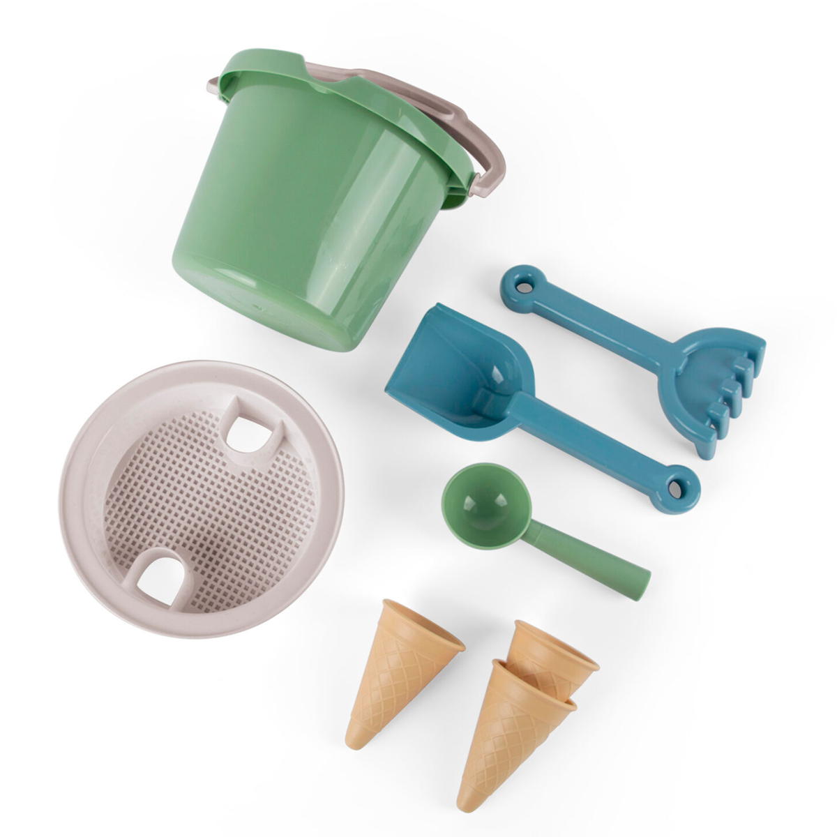 -fint spandsæt fra dantoy -indeholder spand, si, isvafler og andet tilbehør til sand-isene -perfekt til leg med sand -svanemærket -tåler maskinopvask -fra 2 år