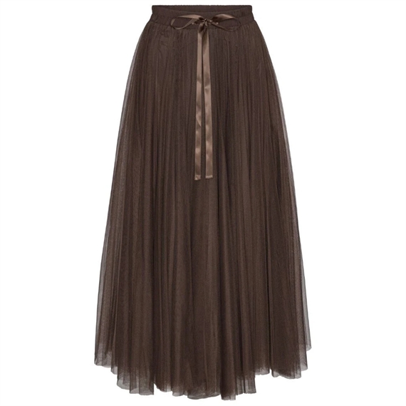 Daisy er en utrolig smuk tyl nederdel fra EMM Copenhagen i en flot chokolade brun farve. Nederdelen har en elastisk talje med lille sløjfe. Smuk nederdel som du både kan style til hverdag og fest! En alsidig nederdel som også kan bruges som kjole. Tip: Du kan nemt klippe lidt længde af hvis du synes den er for lang uden at man kan se det.