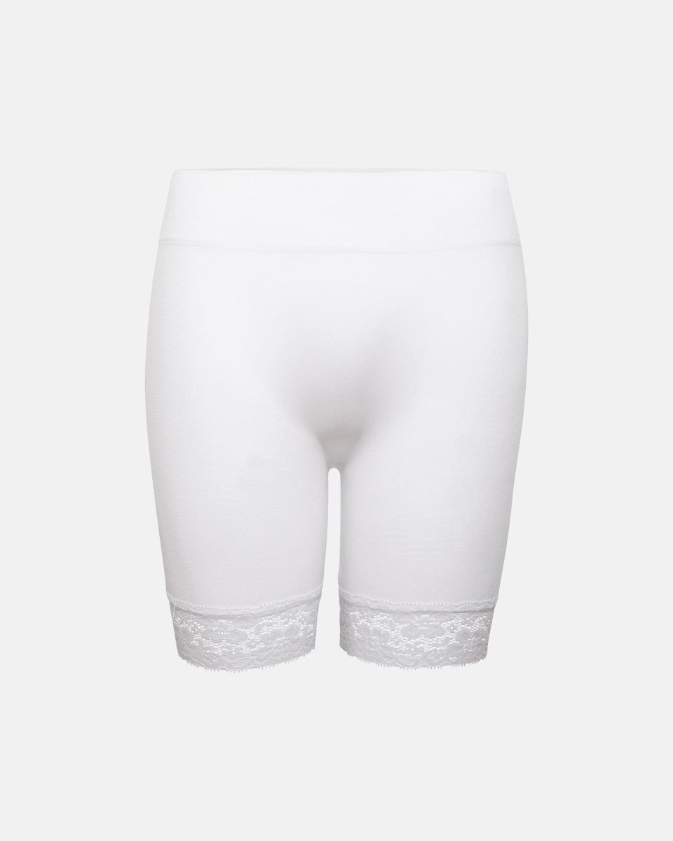 Smarte og behagelige shorts fra Decoy i et ensfarvet hvidt design med flotte blonder. Disse shorts er seamless (sømløs) som gør dem ekstra behagelige at bære uden trælse gener. Veloplagte til under kjoler, nederdele eller som overtræksbukser.