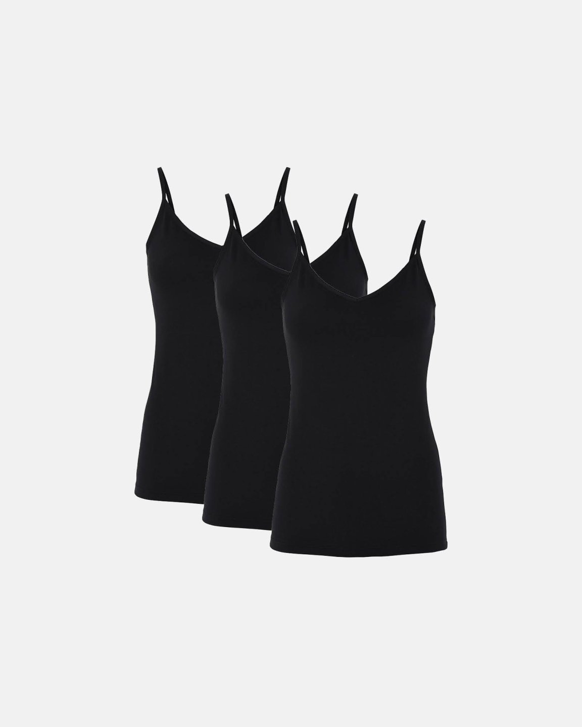 Køb 3-pak top med smalle stropper | GOTS bomuld | sort fra Decoy. Fremstillet i Økologisk bomuld i kompositionen 95% Bomuld (Økologisk), 5% Elastan. Varen er i farven Sort og et must-have i enhver garderobe.