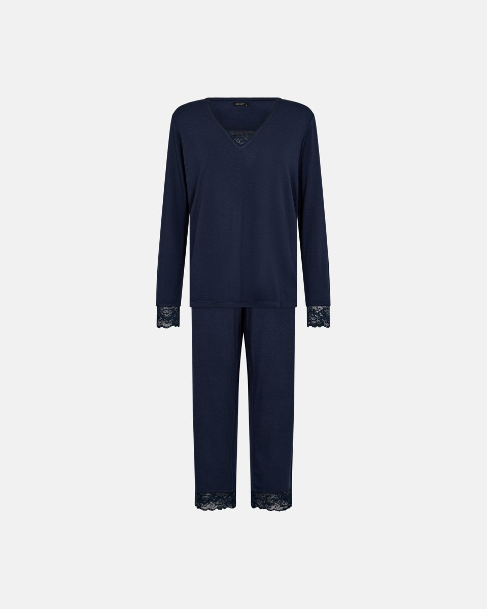 Decoy repræsenterer komfort og stil til den moderne kvinde. Med en forpligtelse til kvalitet og funktion, passer Decoyâs produkter perfekt ind i garderoben hos kvinder, der værdsætter æstetik lige sÃ¥ højt som komfort.Dette pyjamassæt med blonde i farven navy er ingen undtagelse. Materialesammensætningen pÃ¥ 65% viskose fra bambus, 30% økologisk bomuld og 5% elastan sikrer bÃ¥de blødhed og fleksibilitet. Viskosen giver en kølende effekt, der er ideel for en god nattesøvn, mens det økologiske bomuld sikrer, at produktet er bÃ¥de blødt og holdbart, og det lette strejf af elastan giver tøjet en behagelig stretch, der tilpasser sig kroppen uden at stramme.Dette sæt er perfekt til dem, der søger en kombination af elegance og komfort i deres nattøj. Den smukke blondedetalje tilføjer et feminint touch, der gør dette sæt bÃ¥de praktisk og stilfuldt.