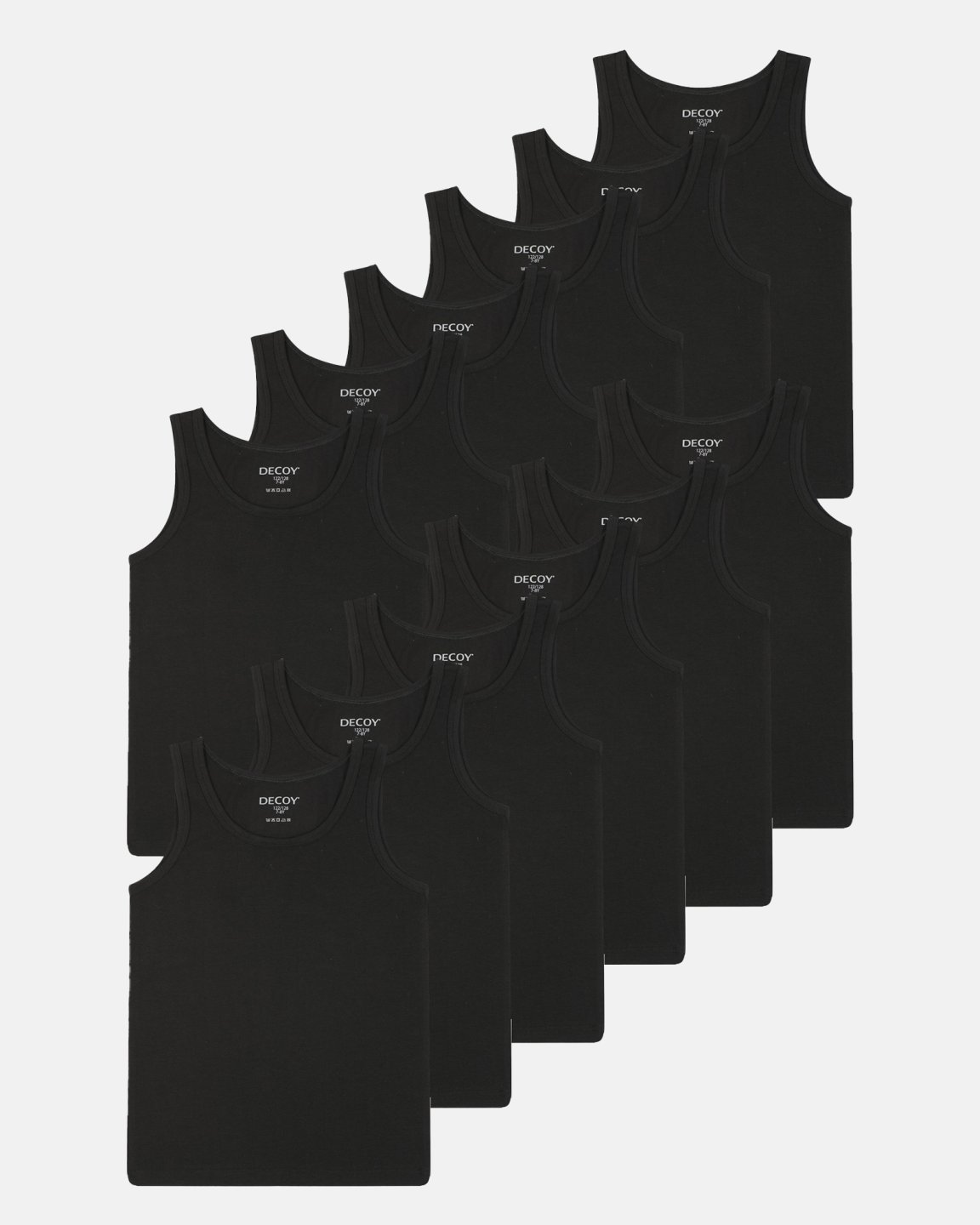 Køb en 12-pak singlet i farven sort fra Decoy. Singletten er uundværlig i basisgarderoben. Toppens komposition sikrer et stof der er åndbart og som føles blødt mod huden, samtidig med at stoffet har et godt stræk og holdbarhed, som sikrer at toppen kan holde formen hele dagen.