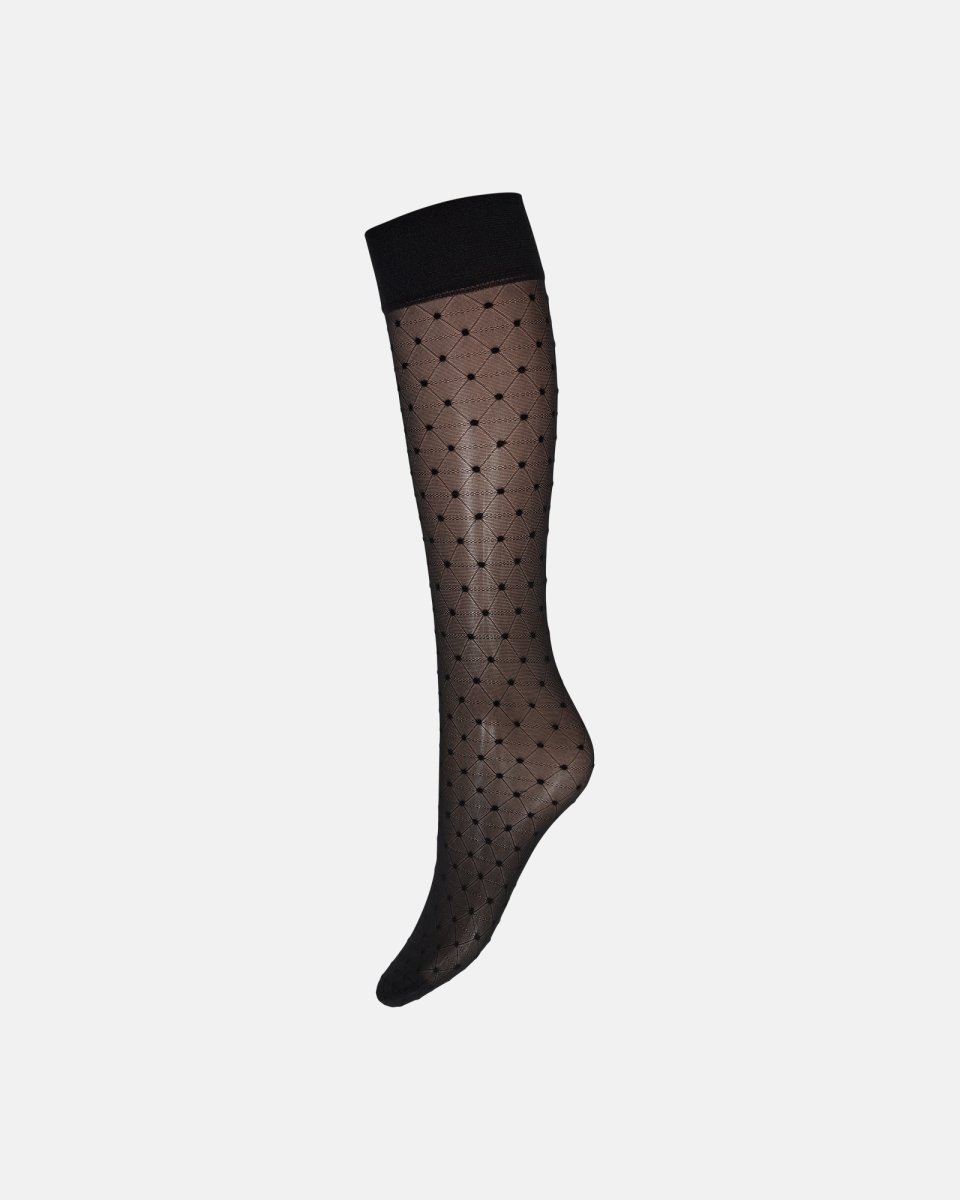 Decoy præsenterer knælang strømpe med dots i 20 denier â enkel og komfortabel til bÃ¥de hverdag og fest. Den sorte, let gennemsigtige kvalitet (87% polyamid, 13% elastan) former sig efter benet uden at stramme og giver en jævn finish. Det netagtige diamantmønster med smÃ¥ prikker tilføjer et stilfuldt detaljeret look, mens den brede elastiske manchet sikrer, at strømpen bliver siddende. Blød og smidig struktur giver god bevægelsesfrihed, nem vedligeholdelse og langvarig brugsværdi.