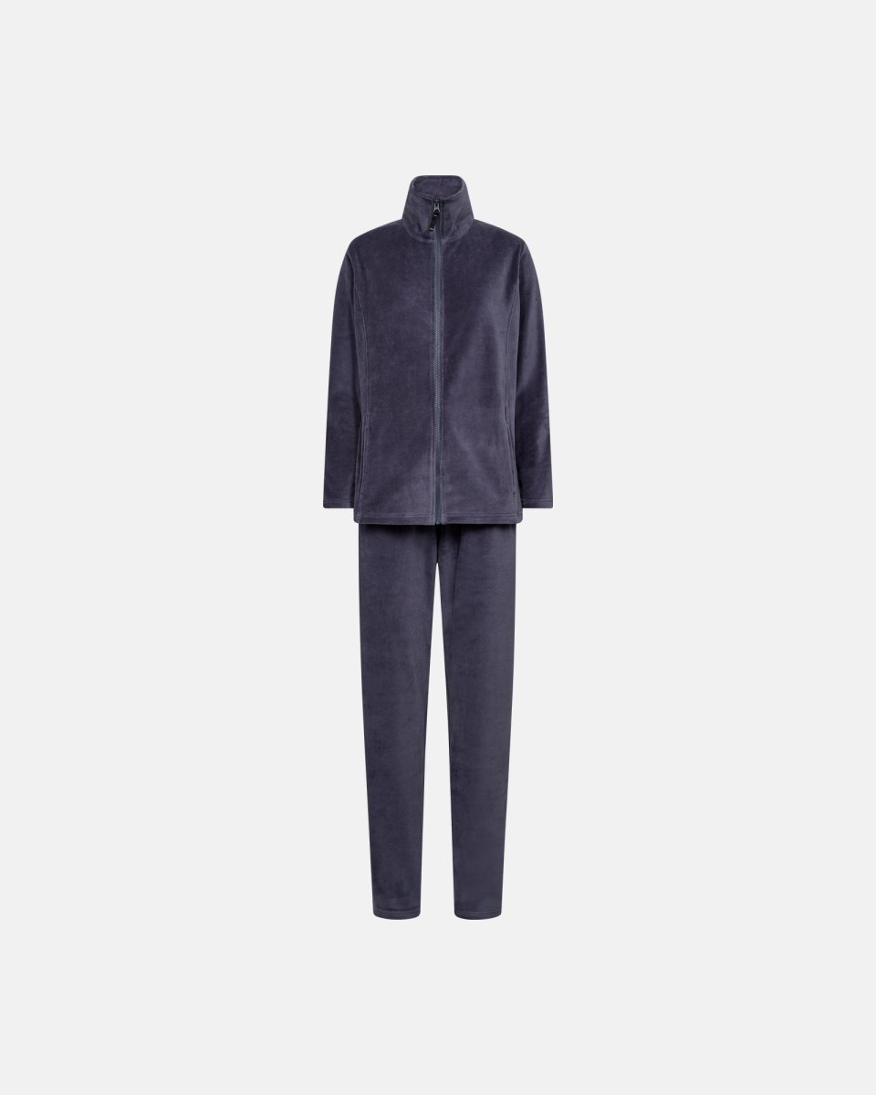 Decoy leverer komfortabel kvalitet og moderne stil med dette bløde velourpyjamas sæt i en elegant blå nuance. Jakken har en høj krave og en lynlås der lukker fra bund til top og giver både varme og bevægelsesfrihed. Bukserne med lige snit og elastik i taljen sikrer en afslappet pasform hele dagen og natten. Det lune velour-lignende stof består af 75% bomuld og 25% polyester for optimal blødhed og åndbarhed. Sættet er designet til at følge kroppen uden at stramme og føles let mod huden. En stilren kombination der passer til rolige stunder derhjemme.