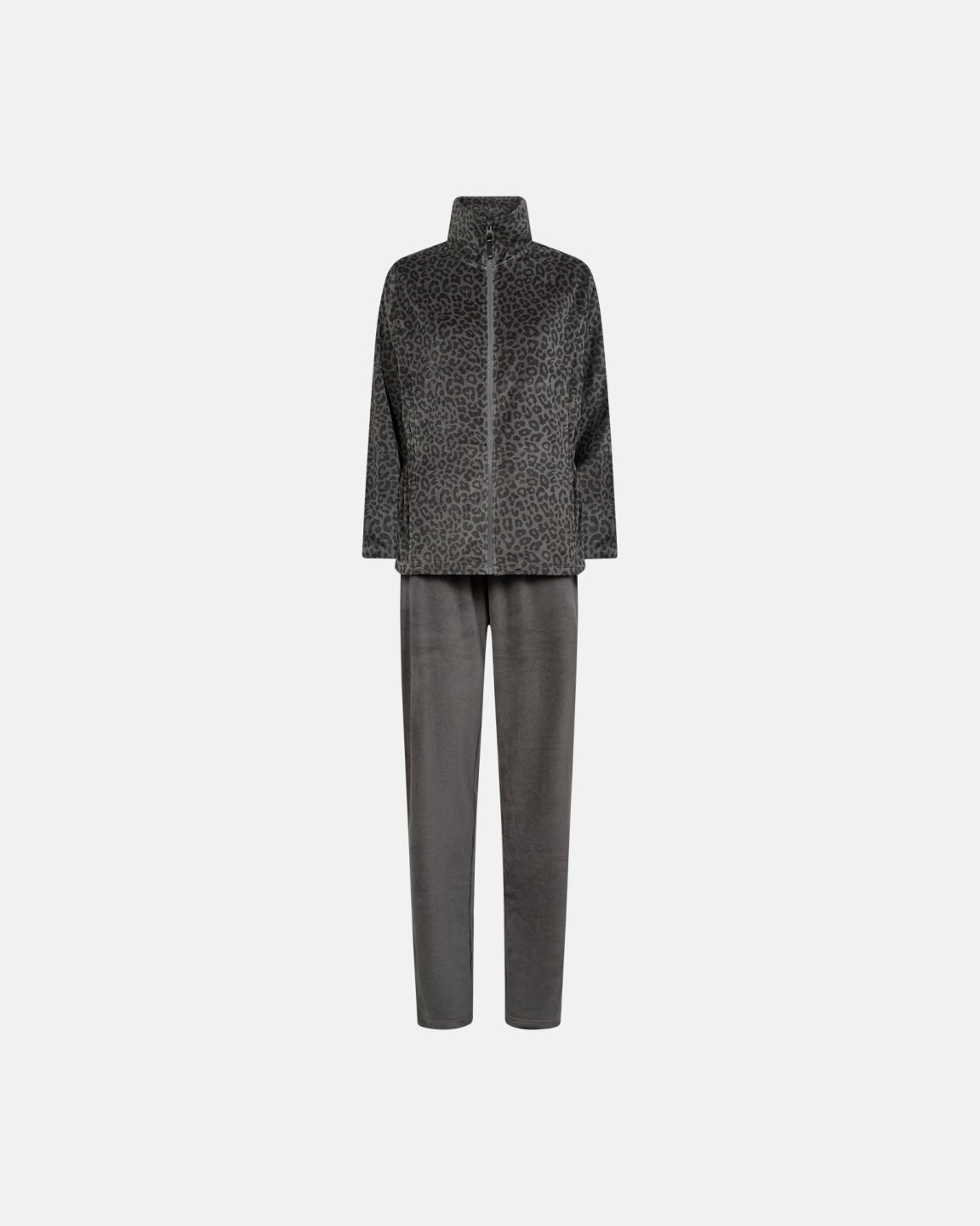 Decoy præsenterer et gråt velour pyjamasæt i 75% bomuld og 25% polyester, der kombinerer blødhed med slidstyrke til hverdagens afslapning. Jakken har et mørkegråt leopardmønster, høj krave og lynlås for et moderne og løsere snit. Bukserne er ensfarvet i matchende mørkegrå med lige pasform og elastisk taljebånd, der sikrer fuld bevægelsesfrihed. Det bløde velourstof føles behageligt mod huden og holder dig varm uden at virke tungt. Perfekt til morgenkaffen, sofa-stunder og en god nattesøvn.