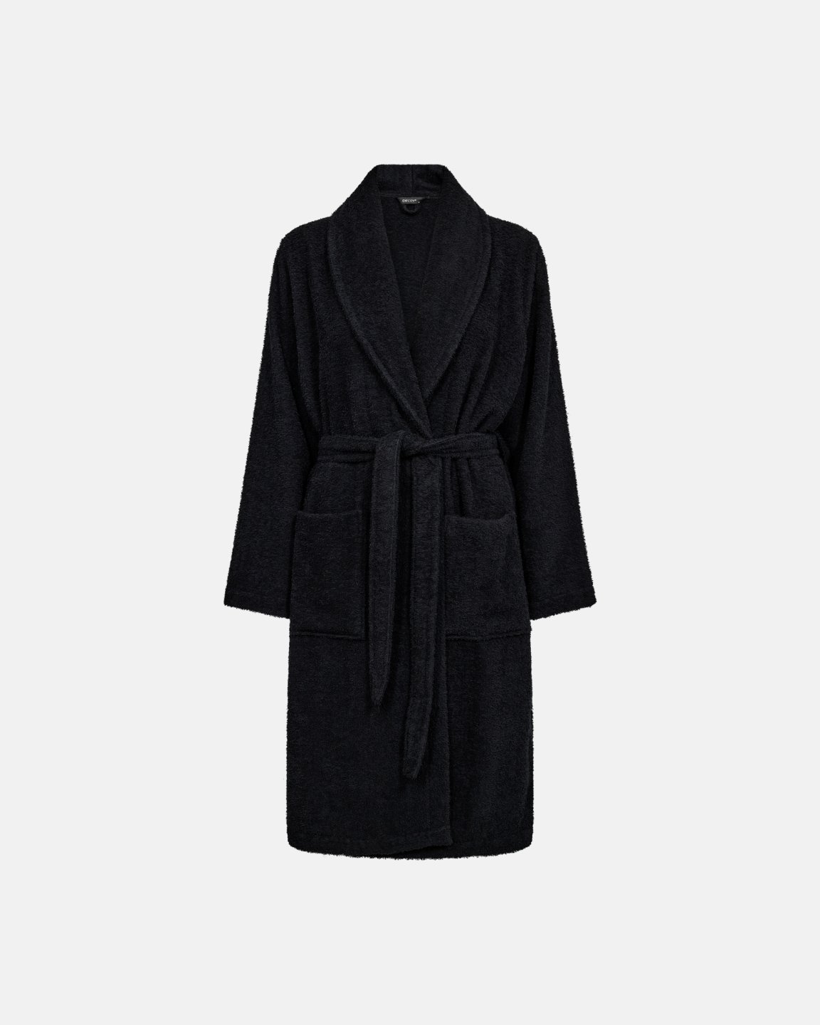 Decoy leverer en klassisk og komfortabel sort badekåbe i blødt frottéstof. Fremstillet af 75% bomuld og 25% polyester, der giver god sugeevne og en blød, holdbar overflade. Løs, afslappet pasform med lange ærmer og en bred sjalskrave for ekstra komfort. Matchende bindebælte i taljen og to store påsyede lommer gør den praktisk i hverdagen. Enkel sort farve, nem at kombinere med din morgenrutine. God kvalitet til prisen.