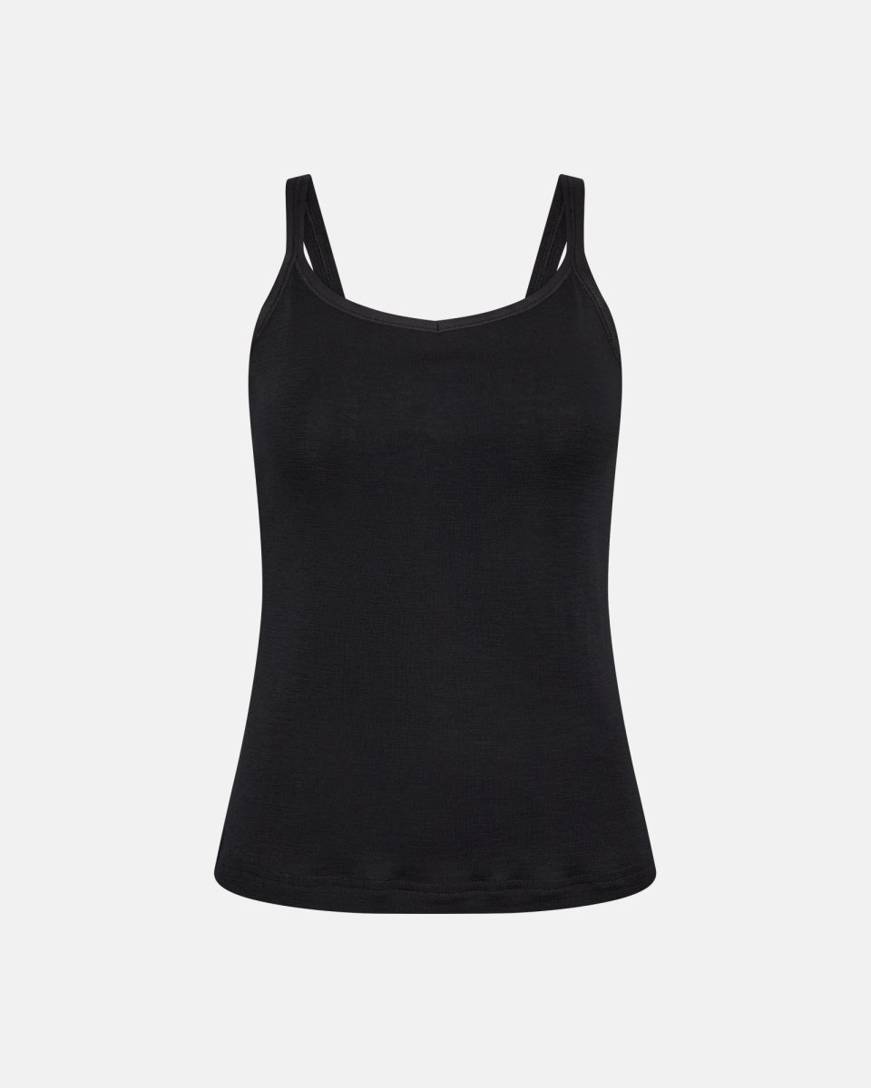 Skab en oase af ro og komfort med den elegante top med smalle stropper, fremstillet i 100% ren uld. Den sorte farve efterlader et tidløst og modigt indtryk, der passer perfekt til enhver garderobe. Materialet i 100% uld sikrer ikke kun varme og blødhed, men understøtter ogsÃ¥ en følelse af naturlig luksus og velvære.Denne top er ideel til de kølige aftener eller som en blød start pÃ¥ morgenen. Den delikate uldkvalitet lover en høj Ã¥ndbarhed og komfort, der omfavner kroppen i hverdagsluksus, samtidig med at den bevarer sin form og elegance. Designet med smalle stropper tilføjer et feminint touch og gør den anvendelig bÃ¥de under en cardigan eller alene, til de mere afslappede anledninger.Træd ind i en afslappet tilværelse og prioriter selvpleje med et stykke tøj, der inviterer til at sænke tempoet og nyde øjeblikket. Enhver kvinde fortjener at føle sig bÃ¥de komfortabel og stilet, uanset dagens aktiviteter.Inviter hygge ind i garderoben og oplev forskellen med denne eksklusive top â perfekt til dem, der værdsætter kvalitet og komfort. Giv dig selv eller en du holder af denne smukke gave og mærk forskellen i hverdagens øjeblikke.