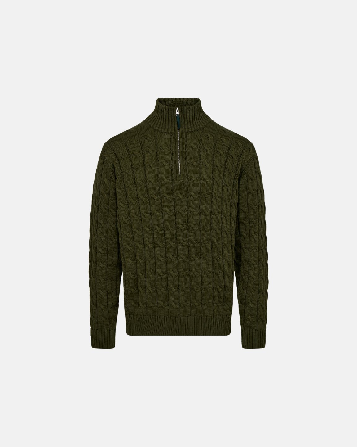 Behagelig og smart cable strik fra ProActive. Strikken er i en grøn klassisk farve og nem at få til at passe ind i garderoben. Hold dig varm i denne flotte strik med stil. Den er produceret i 55% polyacryl og 45% Bomuld, som sørger for at holde dig varm og sætter komforten i højsædet. Cable strikken er med high-neck og en lille lynlås, for at kunne åbne strikken lidt op. En sikker vinder når det gælder valg af flotte strik.
